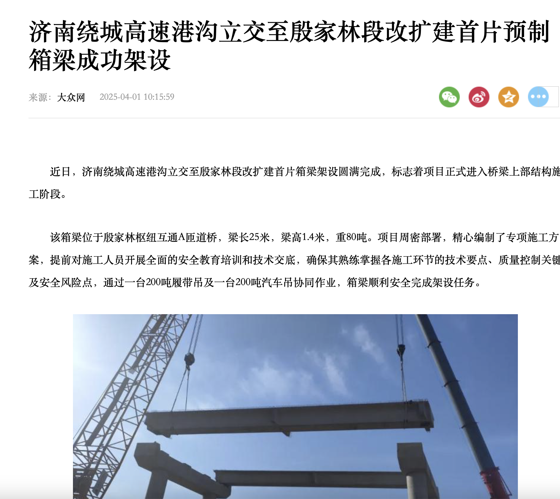 【大眾網(wǎng)】濟(jì)南繞城高速港溝立交至殷家林段改擴(kuò)建首片預(yù)制箱梁成功架設(shè)